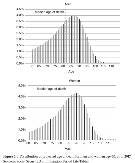 Many people are living far longer than age 75. As you can see from these graphs, as of 2017 these are the distributions of projected ages of death for American men and women currently age 60 (or age 60 as of 2017). When we think of our life expectancy, we normally think in terms of an average or median for someone in our age and risk class. However as you can see from the graphs below, people typically do not go through their lives as statistical medians or statistical averages. On the one hand, many people are living significantly less long than their median life expectancy and on the other hand, many people are living far longer. Furthermore conventional retirement planning frequently starts at age 65 and only plans for a 30-year retirement. If someone retired at 65, that would mean that their funds might run out by the time they are 95. However, as we can see from the charts below, a statistically significant number of people are living significantly past age 95.