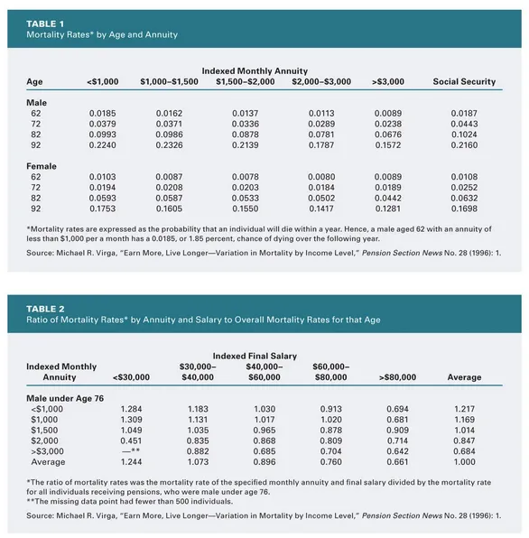 According to Patrick C. Tricker, "Table 1 generally shows mortality rates decreasing as the amount of the monthly annuity payments increase. Table 2 shows that this trend holds even when the data are divided up based on final salary. Some exceptions to this trend exist, but these deviations appear to result from natural statistical variation."